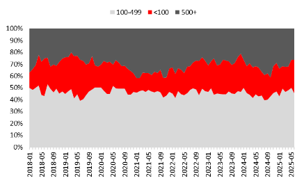 金股推荐更偏好中大市值股票。根据金股市值大小进行统计,市值位于100-499亿的中盘股占比最高,稳定占据金股数量的40-50%,100亿以下的小盘股数量占比在30%以下。主要由于券商金股推荐对象为机构投资者,机构投资者买入小市值股票受限,更偏好中大市值股票。