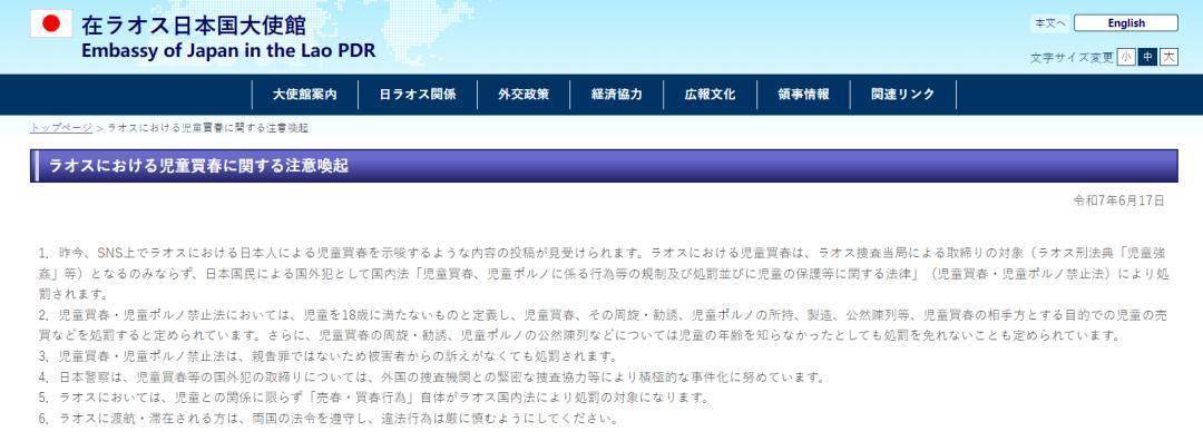 为此,日本驻老挝大使馆在官网向日本民众发布警告称,与未成年人进行性交易在日本和老挝均属违法行为,且该罪行并非自诉犯罪,即使受害者没有起诉,日本警方也将联合外国执法部门打击这一犯罪行为。